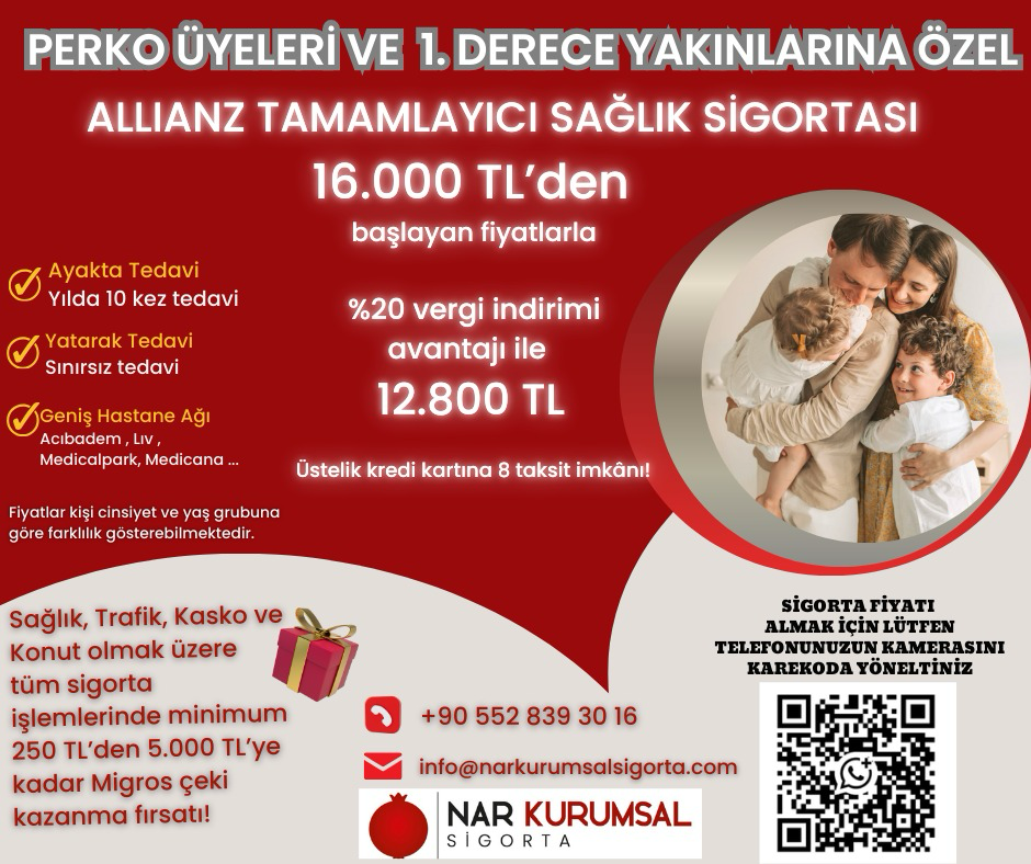 Nar Kurumsal Sigorta, Perko üyeleri ve 1. derece yakınlarına özel Allianz tamamlayıcı sağlık sigortası avantajı sunmaktadır.